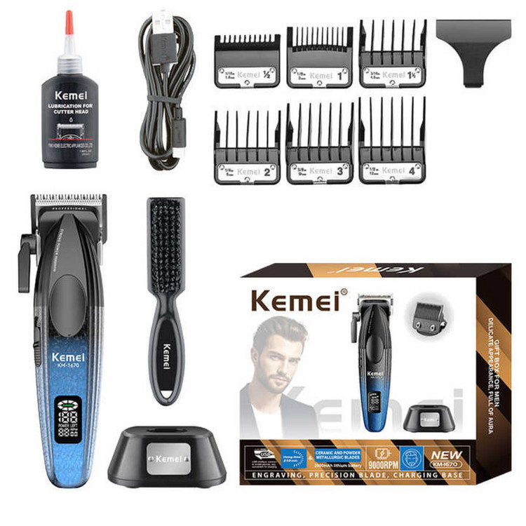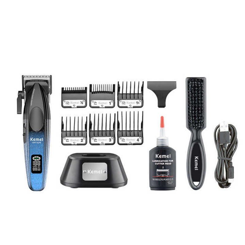 6 شانه در سایزهای 1.5، 3، 4.5، 6، 9، 12 میلی متر - استند شارژ - کابل شارژ - روغن روانکننده - برس تمیز کننده