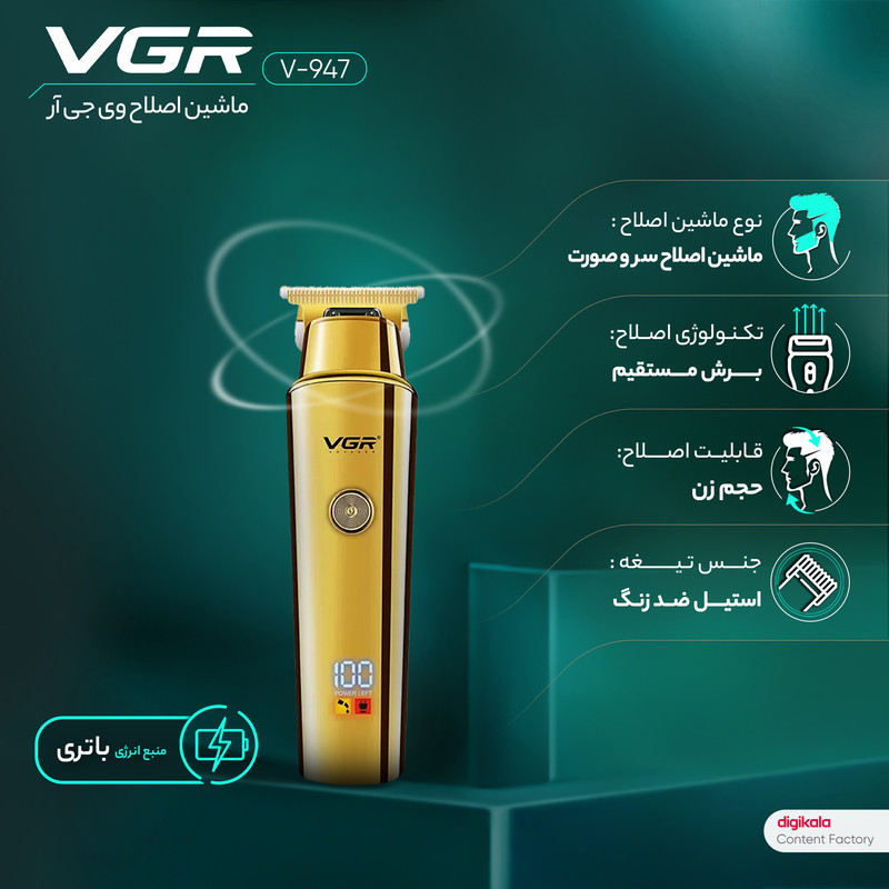 ماشین اصلاح وی جی ار مدل 947 یک ماشین اصلاح با کیفیت بسیار بالا و طراحی زیبا است. تیغه ماشین اصلاح وی جی ار مدل 947 از استیل ضد زنگ میباشد که این نمونه تیغه از کیفیت بسیار بالایی برخوردار است. منبع تغذیه ماشین اصلاح وی جی ار مدل 947 یک باتری قابل شارژ 2000 میلی امپر ساعت از نوع لیتیومی است که هم میتوان با سیم و بدون سیم از دستگاه استفاده کرد. با 4 ساعت شارژ دستگاه میتوان 500 دقیقه مداوم از ماشین اصلاح استفاده کرد. ماشین اصلاح وی جی ار مدل 947 دارای صفحه نمایشگر ال ای دی است که درصد شارژ را نشان میدهد.اقلام همراه ماشین اصلاح وی جی ار مدل 947 اعم از 3 شانه تنظیم کننده به شماره ای 1.5 - 3 - 4.5 ، درپوش محافظ تیغه ، روغن ، برس تمیز کننده ، کابل شارژ یو اس بی است.